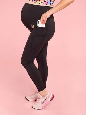 Celebrate every stage of your journey with our Rainbow at Heart Maternity Leggings. These sleek black leggings add a joyful pop of colour with hot pink Sprinkle Positivity detailing on the bottom right leg, a Rainbow Love Heart on the left hip, and a vibrant bright pink inner waistband featuring the playful message “Undercover Dopamine Dresser.”
