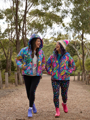 Made from our buttery soft and warm Embrace fabric – double brushed on both sides for a fleece-like feel – these leggings feature a smooth black base with vibrant printed side panels showcasing exclusive Australian designer prints. They’re cosy, soft and finished with our signature side pockets for your everyday essentials.