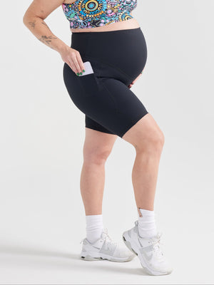 Designed to relieve common pregnancy discomforts, these compression maternity shorts offer firm support for your back, hips, and pelvis, making them ideal for prenatal yoga, Pilates, or simply to provide some extra comfort for your every day. The buttery-soft, squat-proof fabric and extra-high belly band provide comfort through every trimester and postpartum recovery, including after c-section births.