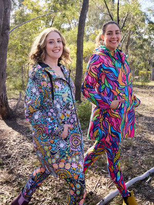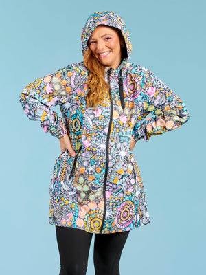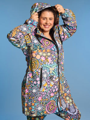 STAY DRY IN COLOURFUL STYLE! Our raincoats have become one of our BEST SELLERS in the range. So it was time that we extended on that range and introduce a NEW longline style! With all the features you know and love about our iconic design – properly waterproofed (to 10,000mm!), fully lined, made from recycled plastic bottles, and showcasing stunning artwork by female Australian artists.