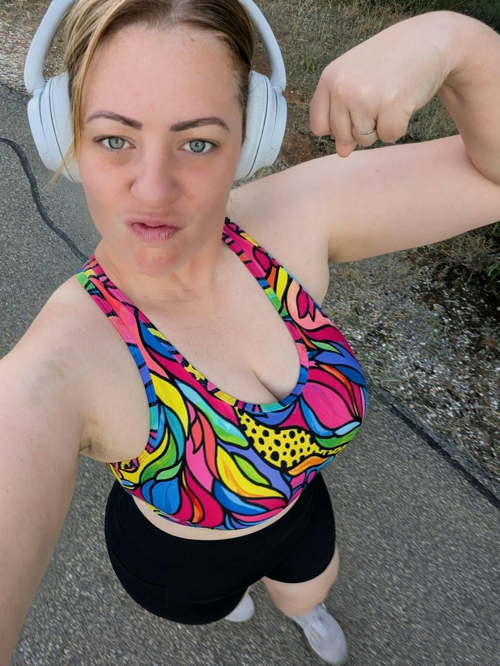 • Steph wears a size XL crop. She is 180cm and her usual bra size is a 16E.